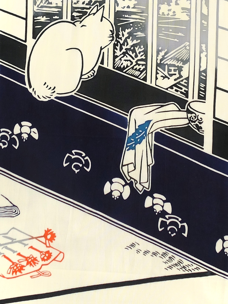 格子から猫が外を眺めている部屋には手ぬぐいとかんざし。