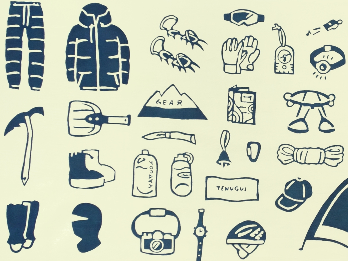 地図・手袋・ゴーグル・ナイフ・水筒・カメラ・バラクラバ